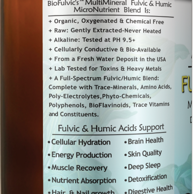 - Fulvic & Humic acids act as a chelating agent in your body, bonding with positively charged free radicals, heavy metals, toxins, and radioactive elements as they clean your cells.