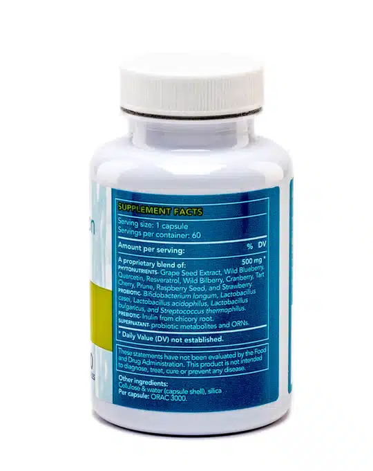 Probiotic- Certified strains of Bifidobacterium longum, Lactobacillus casei, Lactobacillus acidophilus, Lactobacillus bulgaricus and Streptococcus thermophilus (30 billion CFU per gram); Prebiotic- Inulin from chicory Root; Supernatant- probiotic metabolites, and ORNs (Oligoribonucleotides. Also called MicroRNAs); Phytonutrients- Grape Seed Extract, Wild Blueberry, Quercetin, Resveratrol, Wild Bilberry, Cranberry, Tart Cherry, Prune, Raspberry Seed, Strawberry (Total ORAC assay 40,000 per capsule)
