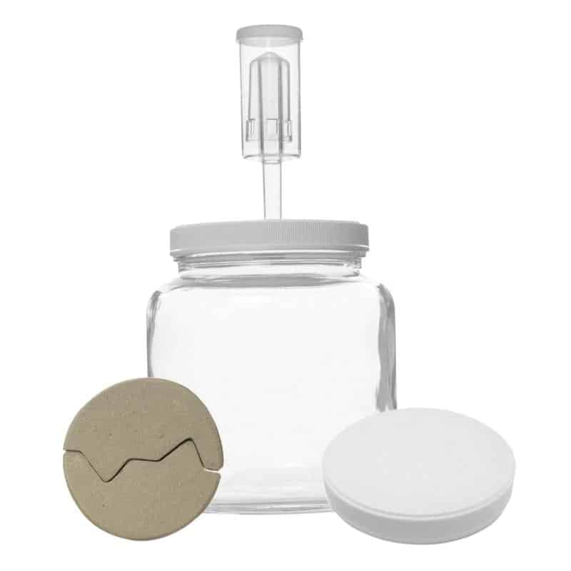 Make fermenting vegetables easier! This half-gallon-size glass jar includes an airlock setup that facilitates gas escaping your fermented vegetables while keeping air out. This allows you to make pickles, sauerkraut, and other fermented vegetables, fruits, condiments, and more while greatly reducing and often eliminating the threat of mold.