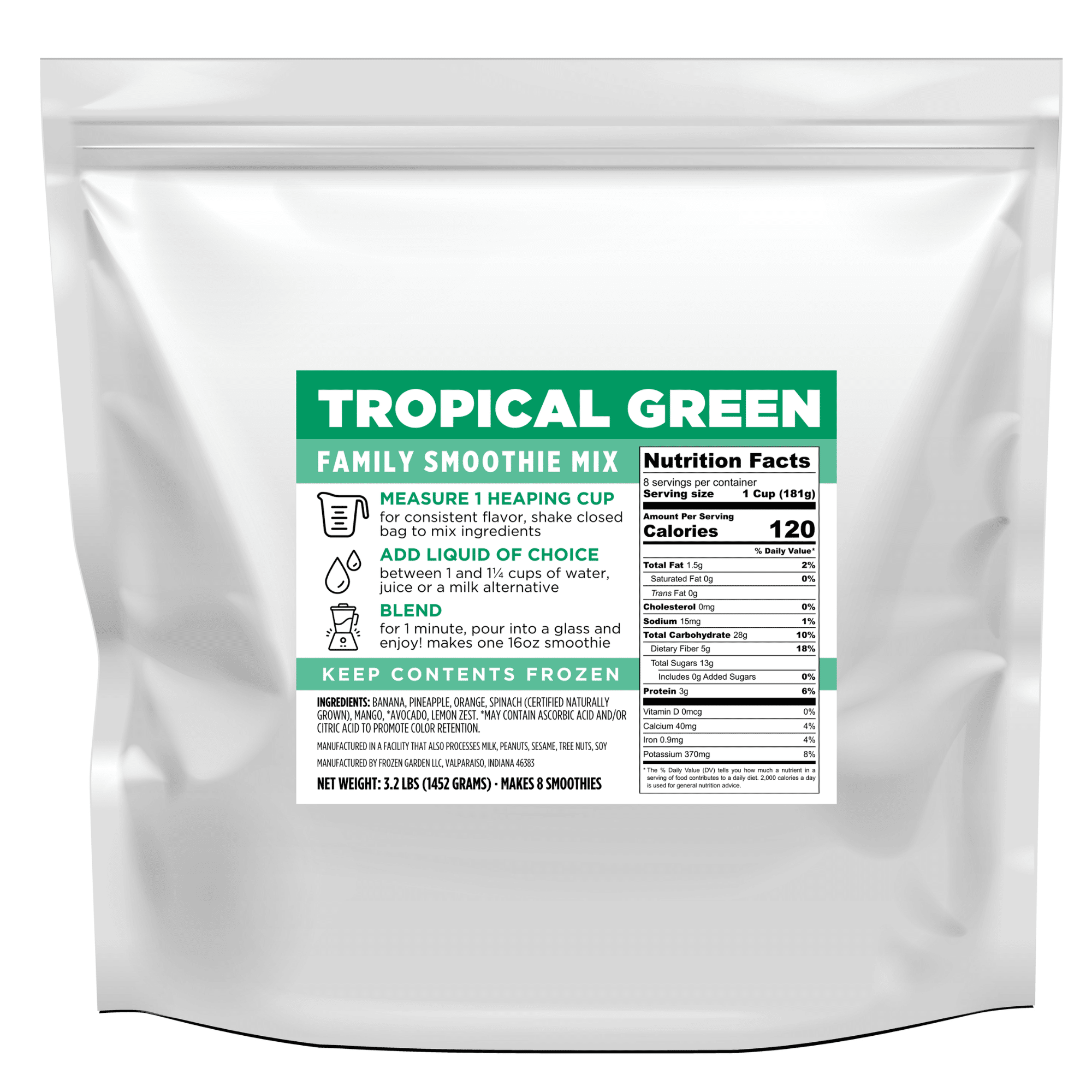 Tropical Green Smoothie á Tropical Smoothie Mix á Makes 8 Smoothies á Family Smoothie Blends á Smoothie Delivery with No Subscription á Introducing our latest creation, the Tropical Green Family Smoothie Mix! This delicious smoothie mix combines the perfect blend of tropical fruits and leafy greens, creating a refreshing and healthy treat for the whole family. Each package of Tropical Green Family Smoothie Mix makes eight 16oz smoothies, providing a convenient and cost-effective way to enjoy a nutritious drink at home. At just $4.99 per smoothie, this mix is an affordable option for those seeking a tasty and healthy beverage. Our expertly crafted smoothie blend includes a combination of banana, pineapple, orange, spinach, mango, avocado, and a hint of lemon zest. These ingredients are carefully selected to provide a burst of tropical flavors while packing in essential vitamins and nutrients. Our Tropical Green Family Smoothie Mix is a must-try for anyone looking to indulge in a tropical smoothie while enjoying the benefits of leafy greens. So why wait? Try our smoothie mix today and experience the delicious taste of the tropics in every sip!
