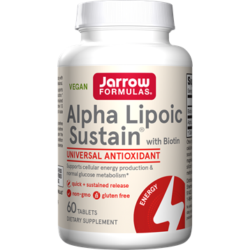 “Alpha Lipoic Acid (ALA) is an antioxidant that supports normal glucose metabolism and cellular energy production. Jarrow Formulas Alpha Lipoic Sustain is formulated with advanced bilayer Sustain tablets that combine 1/3 Quick Release and 2/3 Sustained Release formats to raise and to maintain ALA blood levels over time.”Dietary Considerations Wheat Free Dairy/ Milk Free Gluten Free Vegetarian Soy Free Vegan Egg Free Shellfish Free Fish Free Tree Nut Free Peanut Free Suggested Use Take 1 tablet 1 or 2 times per day with meals or asdirected by your qualified healthcare professional. Serving Size:1 Tablet Servings Per Container: 60 Amount Per Serving Biotin 330 mcg Alpha Lipoic Acid (thioctic acid) 300 mg Other IngredientsCalcium phosphate, microcrystalline cellulose, glyceryl behenate, stearic acid (vegetable source), beet root powder (for color), natural flavor, magnesium stearate (vegetable source), silicon dioxide, coating (hydroxypropylmethylcellulose, stearic acid [vegetable source]).Warnings No wheat, no gluten, no soybeans, no dairy, no egg, no fish/shellfish, no peanuts/tree nuts. Suitable for vegetarians/vegans. If you have a medical condition (especially diabetes or being treated for glucose control), are pregnant, lactating, trying to conceive, under the age of 18, or taking medications (especially for glucose control), consult your healthcare professional before using this product. Keep out of the reach of children. Store in a cool, dry place. NOTE: During use, advise your medical professional that you are taking Biotin before any blood tests. Consult a healthcare professional before using this product if you are trying to conceive, pregnant, or lactating, under the age of 18, or have a medical condition (especially if being treated for glucose control); if adverse reactions occur, discontinue use.