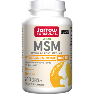 Jarrow Formulas MSM is an organic source of bioavailable sulfur. Sulfur is an antioxidant mineral found in major structural tissues of the body such as cartilage. The sulfur from MSM is used to produce glycosaminoglycans (or mucopolysaccharides) present in proteoglycans, such as chondroitin sulfate, dermatan sulfate and hyaluronic acid.* These sulfur-containing glycosaminoglycans are found in high concentrations in connective tissues, including joint cartilage, skin and collagen.Dietary ConsiderationsWheat FreeDairy/ Milk FreeGluten FreeVegetarianSoy FreeVeganEgg FreeShellfish FreeNon-GMOFish FreeTree Nut FreePeanut FreeSuggested UseTake 1 capsule 1 to 3 times per day or as directed by your qualified healthcare professional.Serving Size:1 Vegetable CapsuleServings Per Container:200Amount Per ServingOptiMSM Methyl-Sulfonyl-Methane (MSM)1000 mgOther Ingredients:Magnesium stearate (vegetable source), capsule consists of hydroxypropylmethylcelluloseWarningsIf you have a medical condition, are pregnant, lactating, trying to conceive, under the age of 18, or taking medications, consult your healthcare professional before using this product. Keep out of reach of children.Suitable for vegetarians/vegans. Store in a cool, dry place.
