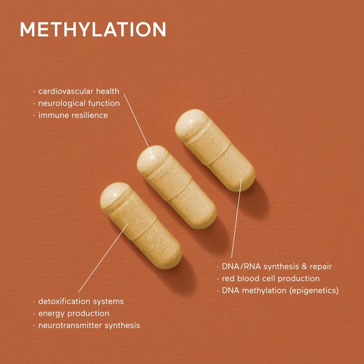 Methylation support+ is an ultra-potent complex that delivers methylated folate as part of a family of fully activated B vitamins (B2, 6, 9, and 12) plus betaine. This gene-focused solution promotes optimal methylation pathways that impact everything from our DNA and neurotransmitters to our heart, brain, energy production, and protein balance.