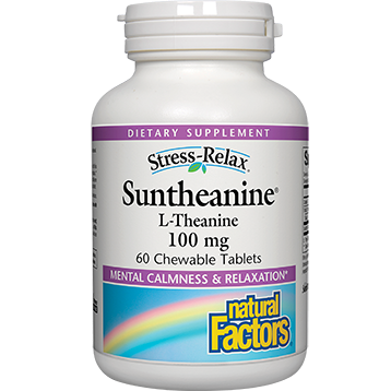 Dietary Supplement’Mental Calmness & Relaxation’Suntheanine contains pure L-Theanine, a unique amino acid found in green tea that is emerging as the premier natural product to support mental calmness and relaxation. Suntheanine is produced via a proprietary enzymatic process, guaranteeing essentially pure L-Theanine for maximum effectiveness. In a tasty tropical fruit-flavored chewable tablet.’Dietary ConsiderationsWheat FreeDairy/ Milk FreeSoy FreeYeast FreePreservative FreeFree of Artificial Colors/Flavors’Serving Size:2 Tablet’Servings Per Container:30’Amount Per Serving Calories 15 ‘Total Carbohydrate 4’g ‘Sugars 3’g ‘Suntheanine L-Theanine 200’mg ”Other ingredients: Organic cane sugar, xylitol, stearic acid, silica, natural fruit flavor (banana, pomegranate, pineapple, mango, passion fruit), citric acid, magnesium stearate (vegetable grade) ””Suggested usage: Chew 1’2 tablets 3 times per day or as directed by a health professional. Keep out of the reach of children.Contains no artificial colors, preservatives, or sweeteners; no dairy, starch, wheat, gluten, yeast, soy, egg, fish, shellfish, animal products, salt, tree nuts, or GMOs. Suitable for vegetarians/vegans. Sealed for your protection. Do not use if seal is broken. For freshness, store in a cool, dry place.’