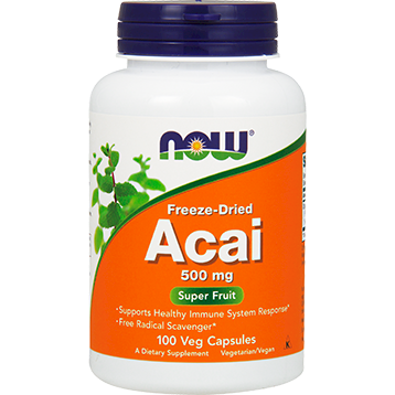 DescriptionAcai Berries, indigenous to Brazil, are one of the planet’s most remarkable and nutritious fruits. They naturally possess phytonutrients such as ellagic acid, rutin, anthocyanins, and catechins. These naturally occurring nutrients help support a balanced immune response and can neutralize free radicals formed through normal cellular metabolism or environmental exposure.* NOW uses only solvent-free, freeze-dried Acai Berries to better preserve the integrity of the nutrients present in fresh Acai.NOW Acai delivers a natural nutrient profile found in Genuine Whole Foods.Natural color variation may occur in this product. Freeze-Dried; Supports Healthy Immune System Response*; Free Radical Scavenger*; ‘Dietary ConsiderationsWheat FreeDairy/ Milk FreeGluten FreeVegetarianSoy FreeYeast FreeSugar FreeStarch FreePreservative FreeSalt FreeVeganCorn FreeEgg FreeShellfish Free’Suggested UseAs a dietary supplement, take 2 Vcaps 1 to 2 times daily.’Serving Size: 2 VCap’Servings Per Container: 50’Amount Per ServingOrganic Acai Palmberry (Freeze-Dried)(Euterpe oleracea) (Fruit Skin and Pulp)1 g’Other Ingredients:Cellulose (capsule), Cellulose, Stearic Acid (vegetable source), Magnesium Stearate (vegetable source)’WarningsContains no sugar, salt, starch, yeast, wheat, gluten, corn, soy, milk, egg, shellfish or preservatives.Vegetarian/Vegan ProductDo not eat freshness packet. Keep in bottle.Store in a cool, dry place.Keep out of reach of children.