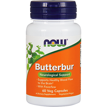 Dietary Supplement Neurological Support; With Feverfew; Supports Healthy Blood Flow to the Brain*; European herbalists have been using Butterbur for decades and scientific studies have demonstrated that Petasins, the active constituents in Butterbur, can support healthy blood flow to the brain and promote normal neurological function. In this way, Butterbur may help to maintain head comfort in healthy individuals.* NOW Butterbur is also free of undesirable Pyrrolizidine Alkaloids (PAs), so it can be used regularly.Dietary ConsiderationsWheat FreeDairy/ Milk FreeSoy FreeSugar FreePreservative FreeSalt FreeEgg FreeShellfish FreeServing Size:1 VCapServings Per Container:60 Amount Per ServingButterbur Extract (Petasites hybridus) (Root) (min. 12% Sesquiterpenes as Petasines) 75mgFeverfew (Tanacetum parthenium) (Herb) 200mg Other ingredients: Cellulose (capsule), Cellulose Powder, Silica, Magnesium Stearate (vegetable source), Stearic Acid (vegetable source) Suggested Usage: Take 1 capsule 2 to 3 times daily.Not manufactured with wheat, gluten, soy, milk, egg, fish, shellfish or tree nut ingredients. Produced in a GMP facility that processes other ingredients containing these allergens.Vegetarian/Vegan Product. Natural color variation may occur in this product.Caution: For adults only. Not recommended for pregnant/nursing women or individuals with liver disease. Consult physician if taking medication or have a medical condition. Keep out of reach of children. Do Not Eat Freshness Packet. Keep in Bottle.