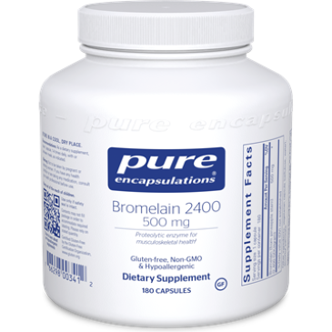 Nutritionally supports the body’s innate ability to digest food and to maintain musculoskeletal comfort at the cellular level Bromelain is a proteolytic enzyme from the stem of the pineapple plant. Taken with food, bromelain aids in the healthy functioning of the digestive system. Taken between meals, bromelain maintains healthy kinin and fibrin production, supporting healthy musculoskeletal function. Supports digestion Helps maintain healthy musculoskeletal tissue Bromelain is a plant enzyme found in the stem of the pineapple Made with hypoallergenic, vegan ingredientsDietary ConsiderationsGluten Free Non-GMOServing Size: 1 Vegetable CapsuleServings Per Container: 180Amount Per ServingBromelain (from pineapple stem) (2,400 GDU/gram) 500 mgOther Ingredientsvegetarian capsule (cellulose, water), ascorbyl palmitateSuggested UseAs a dietary supplement, take 1 capsule, 1-4 times daily, with or between meals, as indicated.WarningNot to be taken by pregnant or lactating women. If you have any health condition or are taking any medication, consult your health professional before use. Keep out of the reach of children. Use only if safety seal is intact. Store in a cool, dry place.
