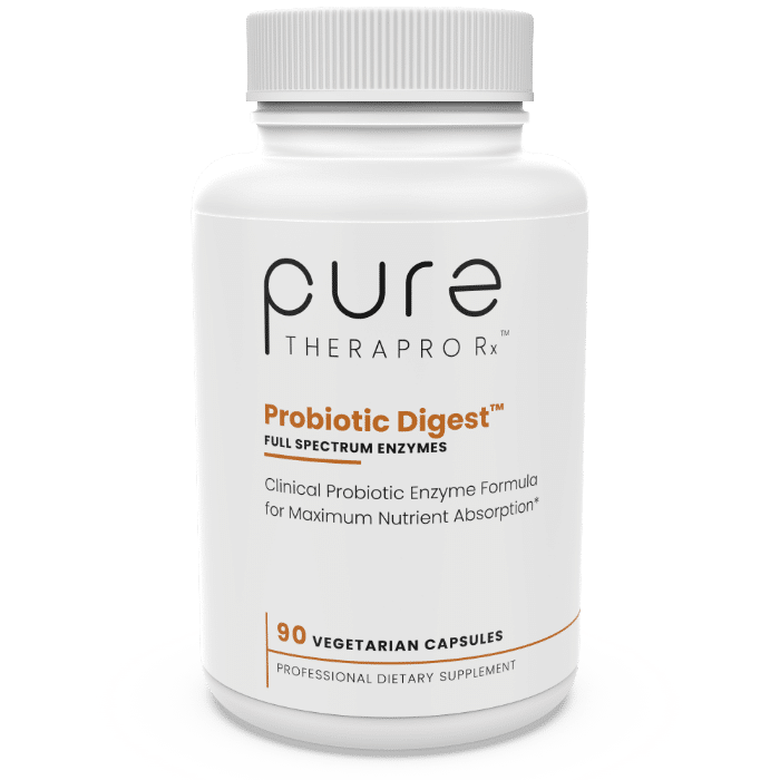Probiotic Digest Full Spectrum Enzymes™: Pure TheraPro Rx’s full-spectrum Digestive Enzymes is an advanced, comprehensive enzyme formula designed to be suitable for vegans, vegetarians, and omnivores alike. It is the ultimate solution for those looking to encourage vibrant gut health, optimize nutrient absorption from a wide variety of foods, and support a healthy inflammatory balance and maximum digestive comfort. Formulated with clinically tested enzyme strains designed to easily break down proteins, fats, carbohydrates and fiber, it is also supremely effective at digesting complex, potentially inflammatory foods such as gluten, dairy sugars and proteins such as lactose and whey, as well as nuts, seeds and legumes. We also enhanced our vegetarian and vegan plant-based enzyme blend with clinically studied & patented Lynside CNCM I-3799 Saccharomyces Boulardii, a powerful probiotic for gut health and healthy digestion. FULL SPECTRUM PLANT BASED DIGESTIVE ENZYMES: Pure Thera vegan Probiotic Digest Full Spectrum Enzymes are a comprehensive blend of the most-effective digestive enzymes strains available today. These cutting edge vegan enzymes for women and men help break down fat, protein and carbohydrates with high-strength lipase, protease, and amylase multi-enzyme blends. The vegetarian enzyme blend also includes specific enzymes for cellulose, fiber, beans & legumes, sugar alcohols, lactose, gluten, and more. ENHANCED WITH SYSTEMIC ENZYMES: Many digestive and systemic enzymes supplements come from the bile of an ox’s gallbladder, or from a factory farmed pig’s pancreas. At Pure Thera, we utilize only plant-based, vegan digestive and systemic enzymes that are active and effective at pHs normally found in the human digestive tract, not an animal’s. We also utilize plant-based systemic enzymes, such as Serrapeptase, which support a healthy inflammatory balance when taken on an empty stomach. ENZYMES FOR DAIRY AND GLUTEN DIGESTION: Two of the most commonly consumed foo