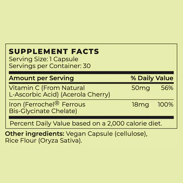 Up to 30% of people worldwide are impacted by an Iron deficiency. Our vitamin uses ferrous bisglycinate iron for increased absorption, combined with a wholefood vitamin C made from acerola cherry.